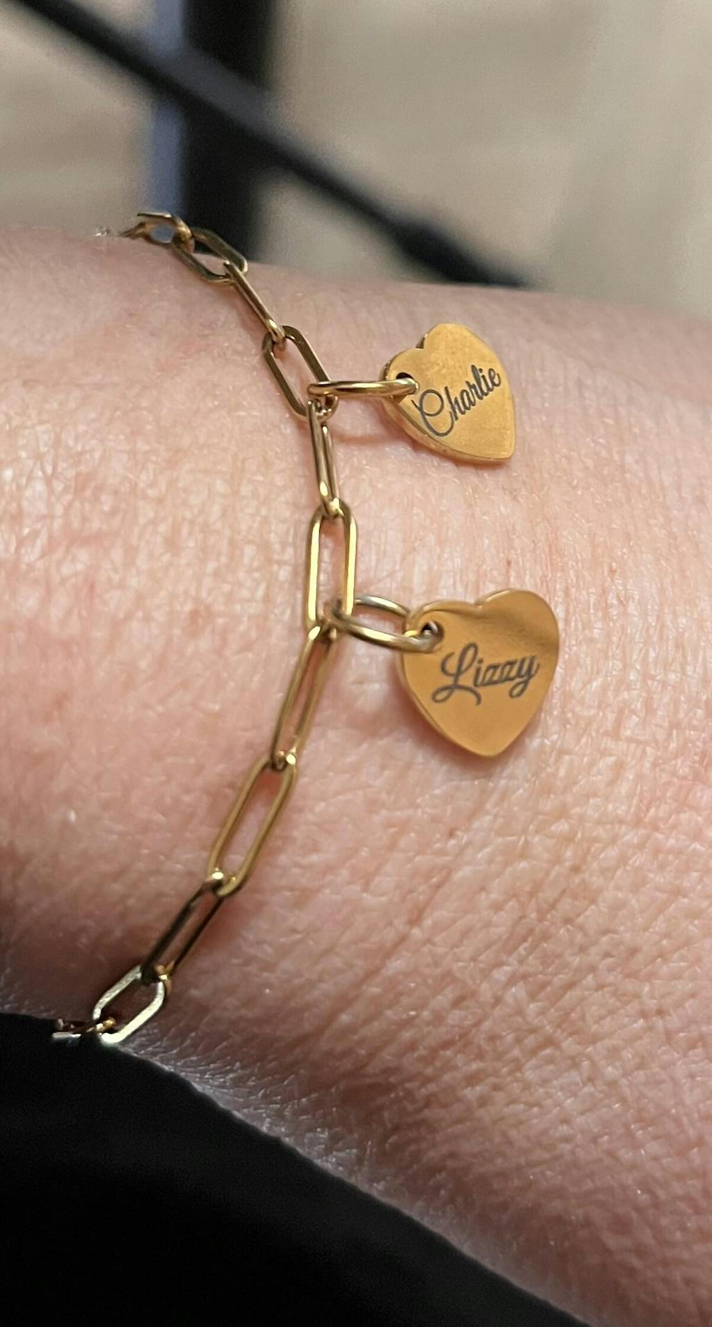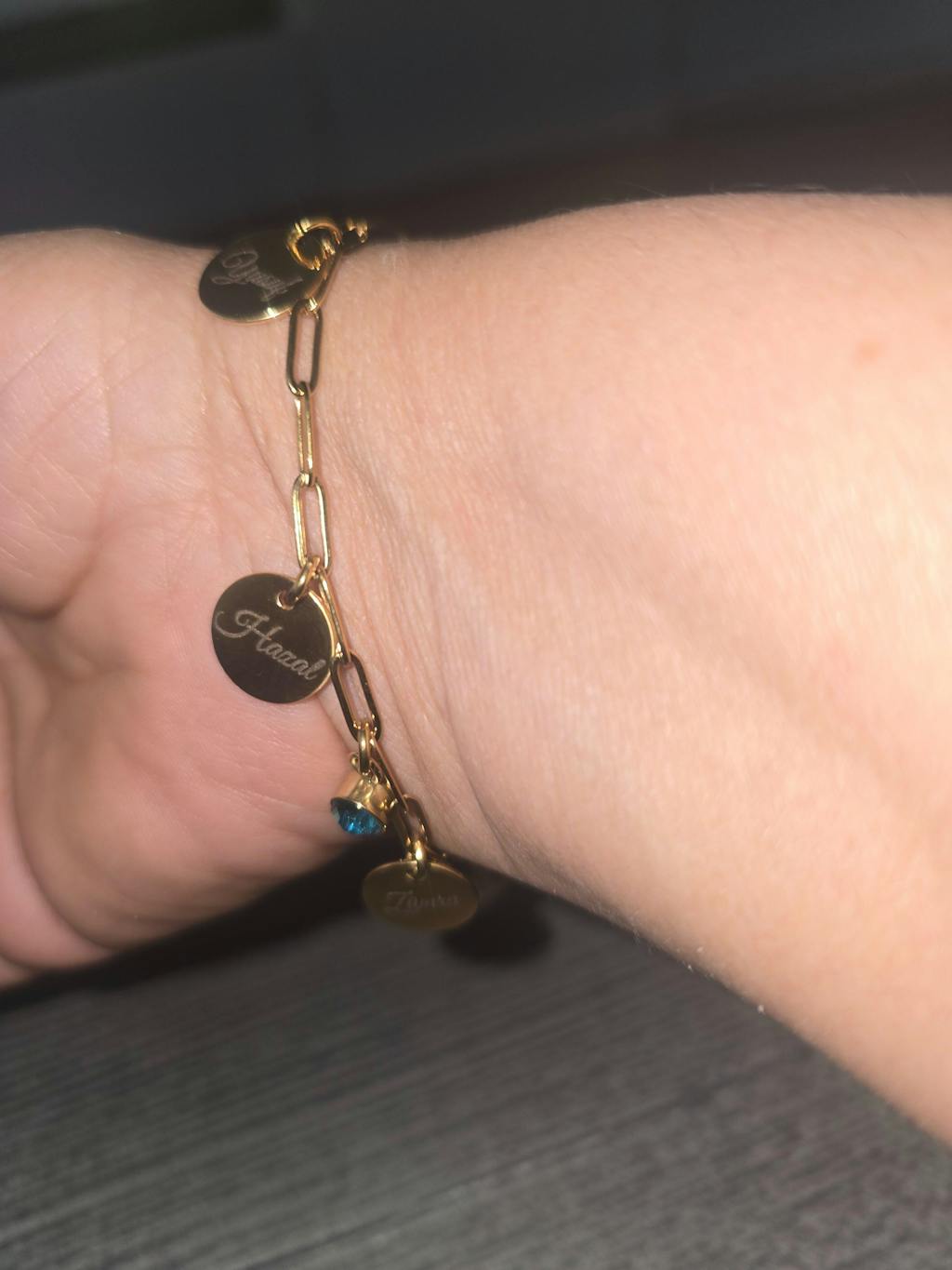 A modern bracelet featuring a refined paperclip chain and delicate charms. Personalize it with up to 8 names, words, or dates. Optionally add a sparkling zirconia stone (white, red, or blue) for an extra touch of meaning.